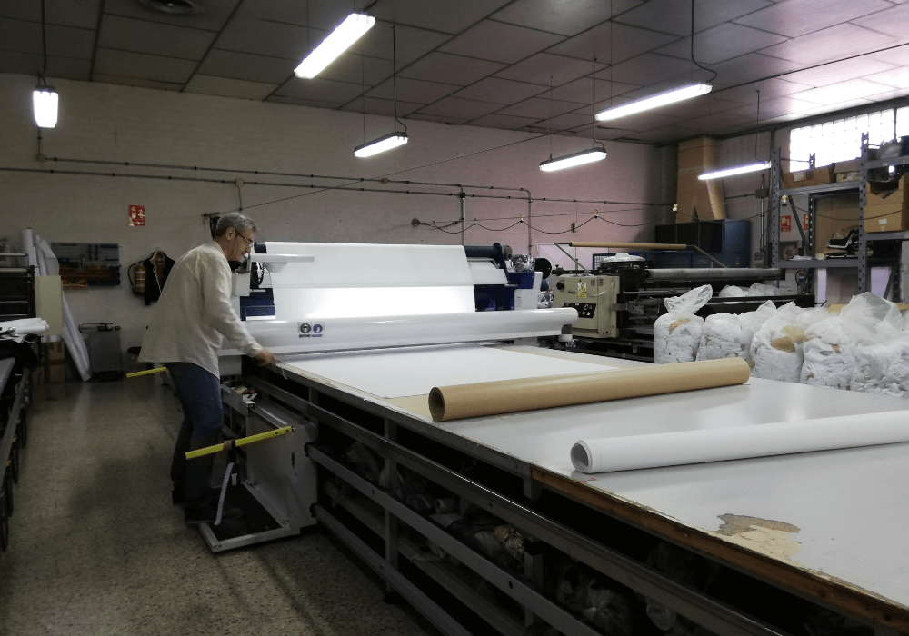 Empezaremos por lo que llamamos el TIEMPO DE REPOSO, que consiste en desenrollar el textil en forma plegada y dejarlo reposar para que recupere su forma tras estar tanto tiempo enrollada. Gracias a esta parte del trabajo conseguimos prevenir que encogimientos o fallas en las prendas.